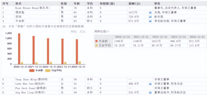 可以看出,牛余新在农产品和食品加工行业有着丰富的经验,但近五年来,他的薪酬却在逐步下降。从2020年到2024年,他的薪酬分别为1200万元、1100万元、1012万元、996万元、972万元,累计降薪228万元。而尽管他的薪酬已经连续多年下降了,但他目前的薪酬在公司高管中仍处于较高水平,仅次于公司总裁穆彦魁。