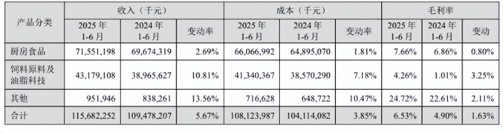 从产品来看,今年上半年,金龙鱼的核心业务厨房食品业务收入达715.51亿元,同比增长2.69%,占总收入的61.8%,毛利率同比提升0.8个百分点至7.66%,仍为公司营收主力,饲料原料及油脂科技业务实现收入431.8亿元,同比增长10.81%,毛利率同比增长3.25个百分点至4.26%,销量和毛利率增速更显著。